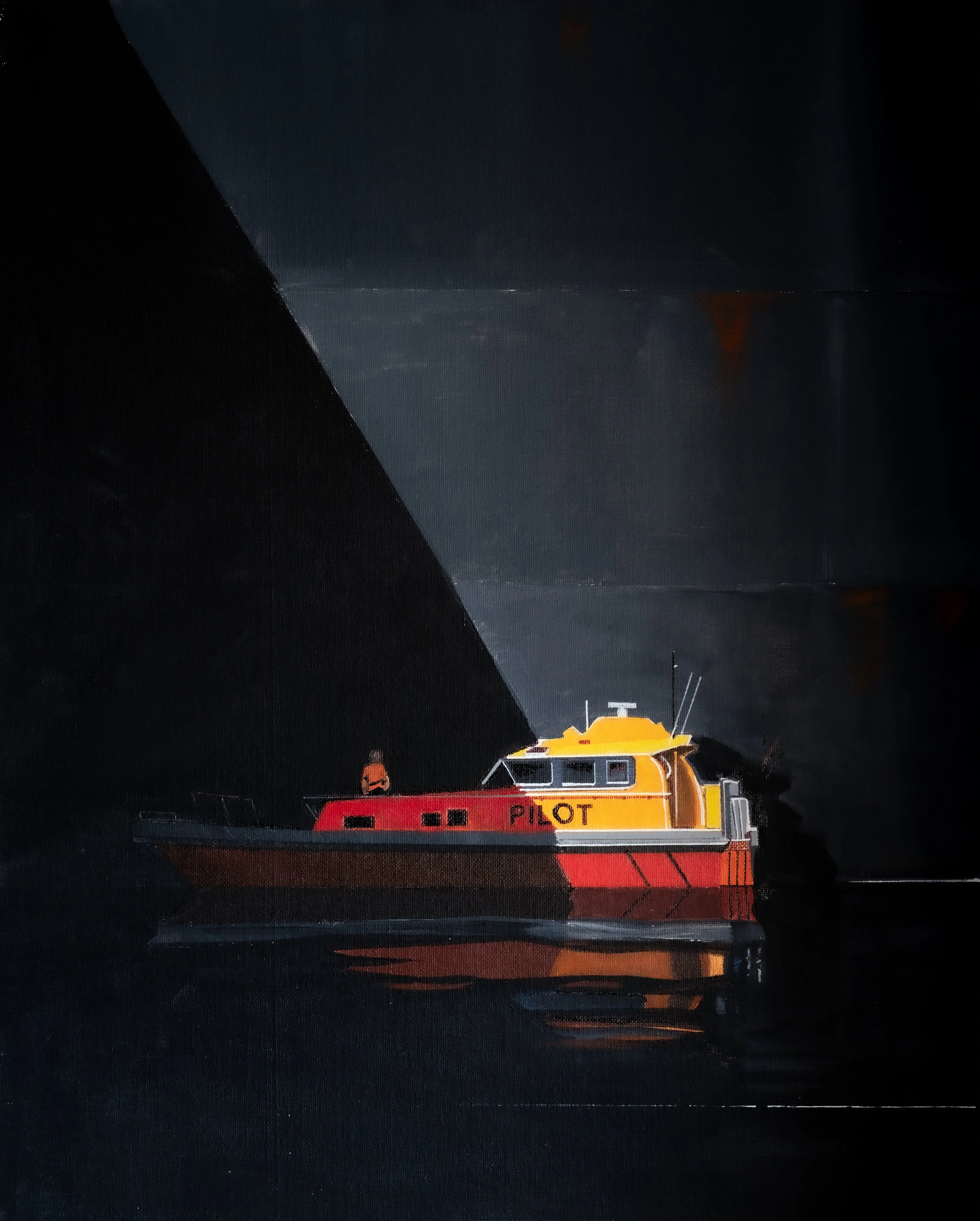 This painting depicts a pilot boat alongside the hull of a much larger vessel. The boat’s yellow roof and red hull stand out against the dark surface of the ship, where a narrow band of sunlight cuts across the scene and defines the forms. Reflections in the still water repeat the limited colour palette and add depth without distracting from the central subject.