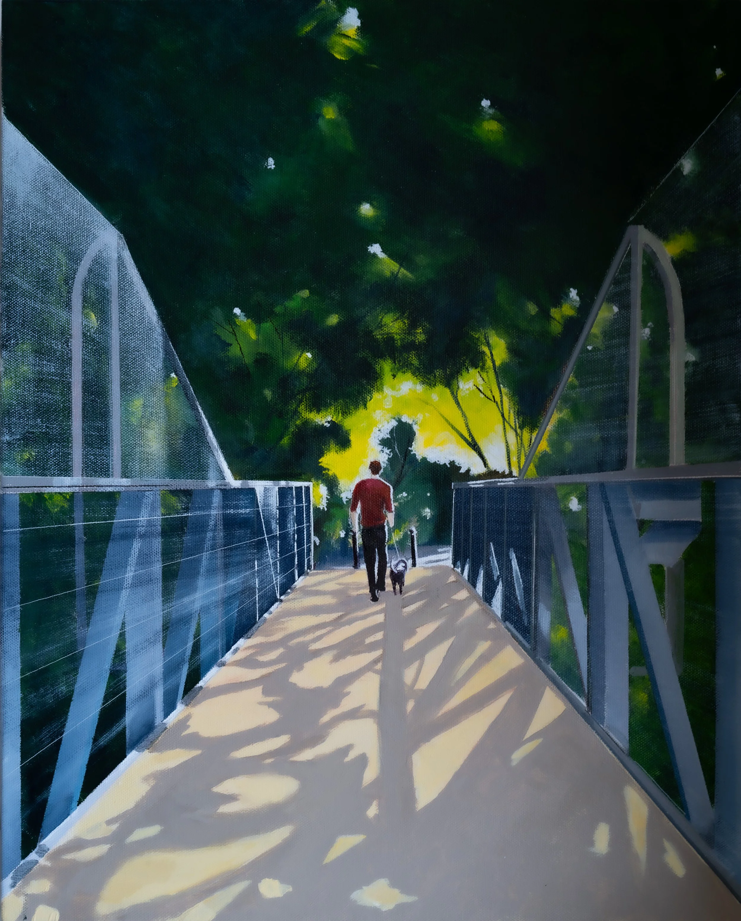 This painting shows a man and his dog crossing a modern pedestrian bridge. Sunlight filters through surrounding trees, creating patterned light and shadow across the walkway. The strong linear perspective draws the eye toward the distance and gives the scene depth.