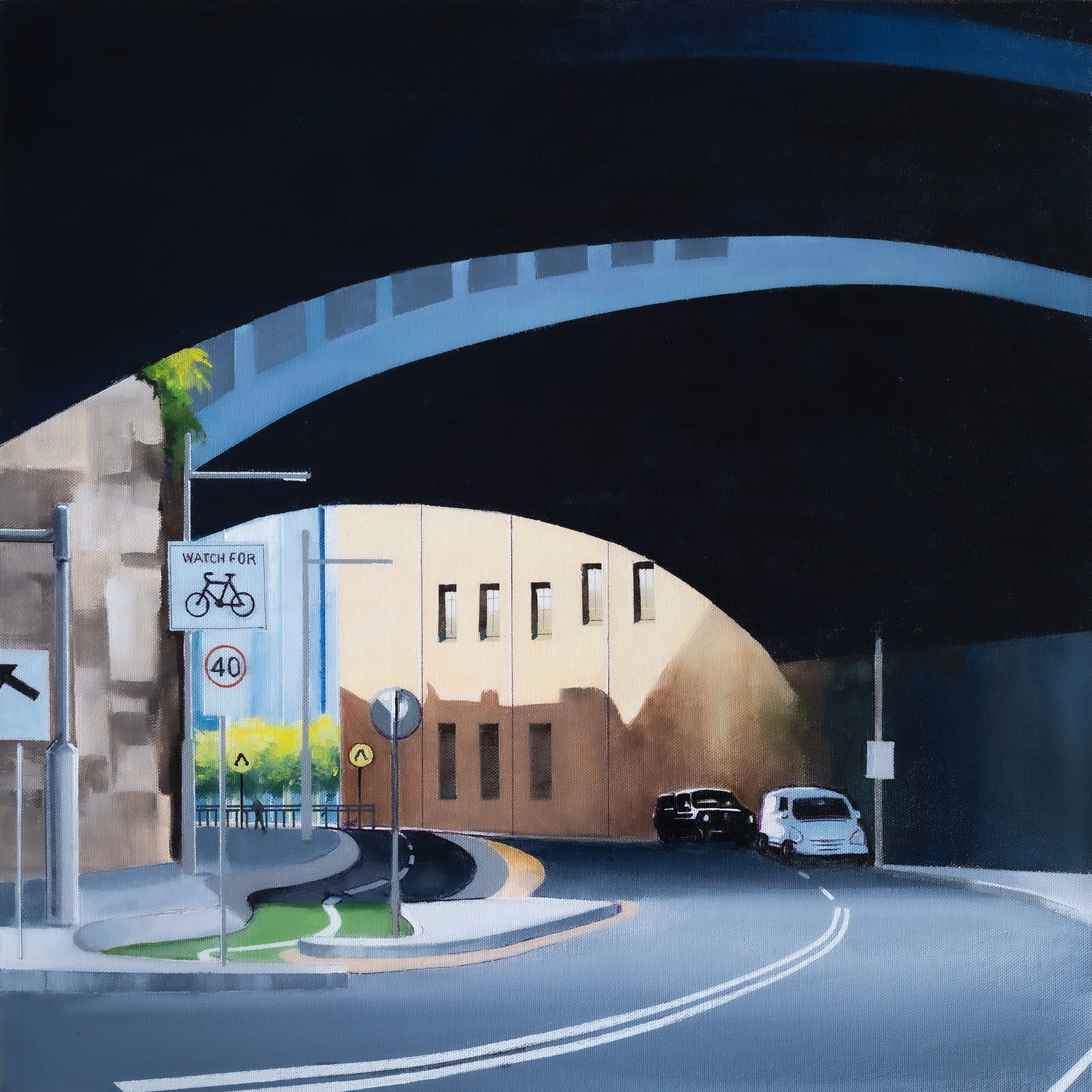 This painting presents an urban scene under a bridge, defined by both stark contrasts and subtle details. The bold arch of the bridge dominates the composition, casting a deep shadow across the roadway. Below, the pavement curves smoothly, leading the eye towards brightly illuminated buildings in the distance. Traffic signs and a bicycle lane add a sense of movement and life, while two parked cars anchor the scene in everyday realism. The use of light juxtaposes the vibrant sunlit areas against the brooding darkness of the underpass. The piece balances geometric and organic forms, creating a dynamic visual narrative that invites viewers to explore the interplay between natural light and architectural elements. The scene is both familiar and enigmatic, offering a slice of urban life imbued with dramatic tension and tranquility.